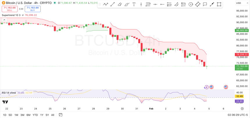 Notably, Bitcoins current price action is testing key support near $71,000, with the Supertrend indicator acting as immediate resistance at around $76,206.22. The price has been under pressure, and the Supertrend remains in the red zone, suggesting a bearish sentiment. If Bitcoin fails to hold the support near $71,162.68, it could see further downside, targeting $70,000, and potentially $67,500 as the next support level.