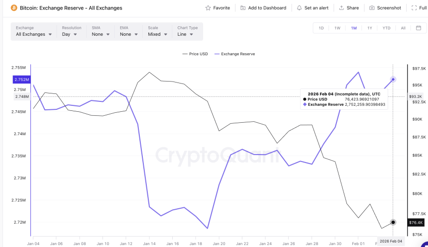 Bitcoin exchange reserves hit a recent low of 2.718 million $BTC on January 19. Since then, reserves have climbed to about 2.752 million $BTC.