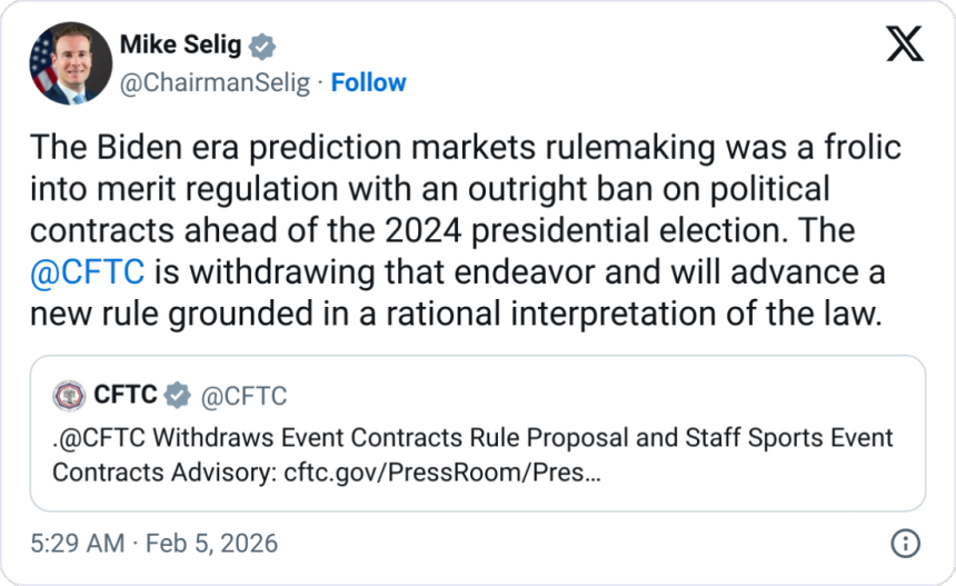 WikiBit 2026-02-05 12:00The US Commodity Futures Trading Commission has withdrawn a Biden administration-era proposal that w