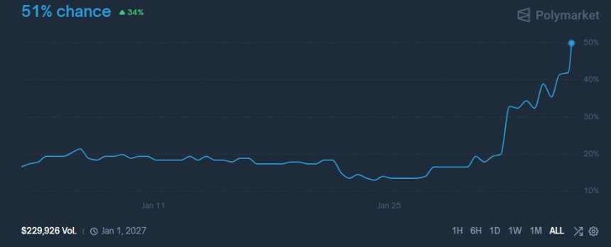 A prediction market launched on the cryptocurrency prediction platform Polymarket has begun pricing in a remarkable scenario for the year 2026.