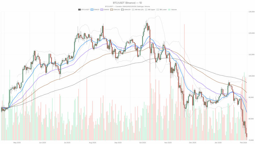 In this environment, trading decisions hinge less on calling the exact bottom or top and more on respecting the dominant daily downtrend while recognizing the potential for violent, counter-trend rallies. The $70,000level and the $73,000area above are the immediate reference points to judge whether current action is just another leg down or the start of a more meaningful bounce.