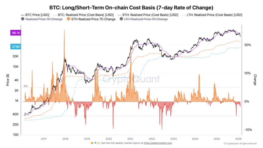 Most of the time, Bitcoin trades above the average price long-term holders paid. When it slides down toward that average, the market starts testing conviction in a way that is hard to fake.