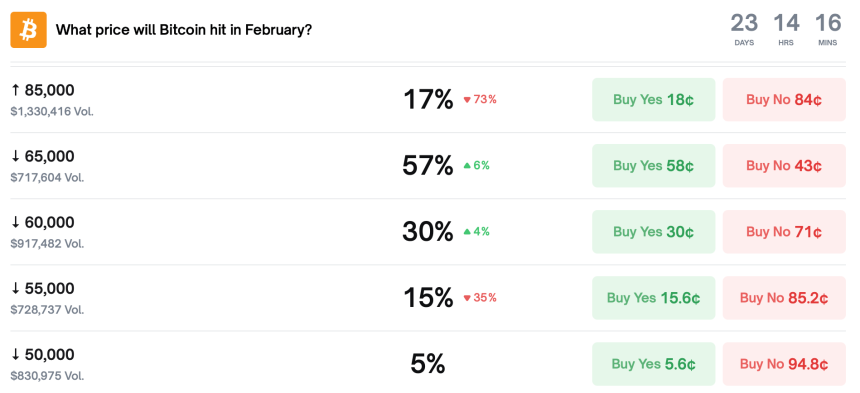 Implied odds on Polymarket show the strongest concentration around the $60,000 to $65,000 range. The $65,000 contract currently carries the highest probability at 57%, while $60,000 is priced at 29%. Together, the two levels represent the markets core expectation for February trading.