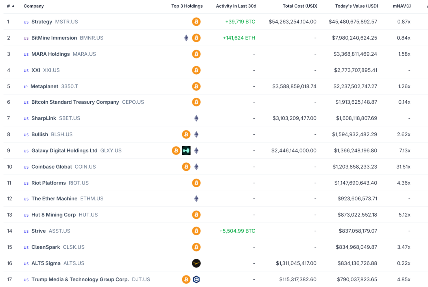 mNAV Falls Below 1 For Most Crypto Treasuries. Source: CoinGecko