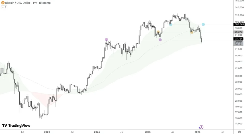 Bitcoin traded at $70,524 as of writing, posting a 7.64% daily loss and extending its weekly decline to more than 20%. The king crypto struggled to stabilize after heavy selling pushed prices toward levels last seen in November 2024.