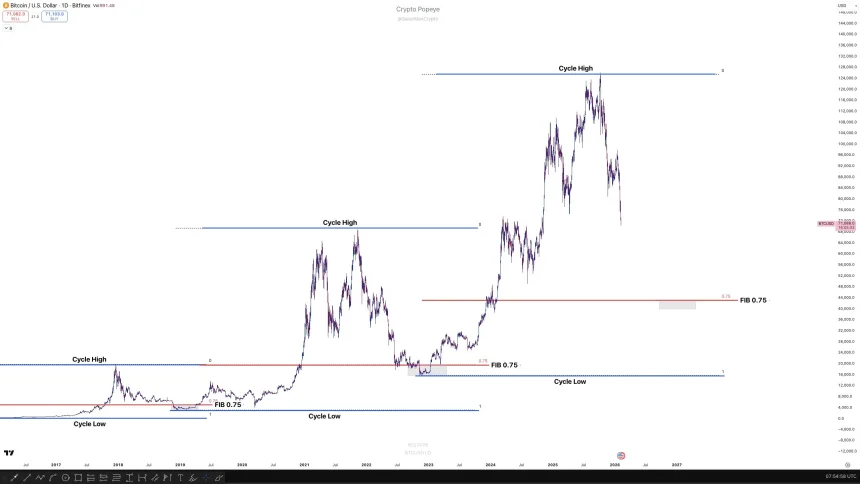 Failure to hold above $70,000, however, shifts attention toward deeper retracement zones near the 0.75 Fibonacci level around $44,000, based on prior cycle behavior.