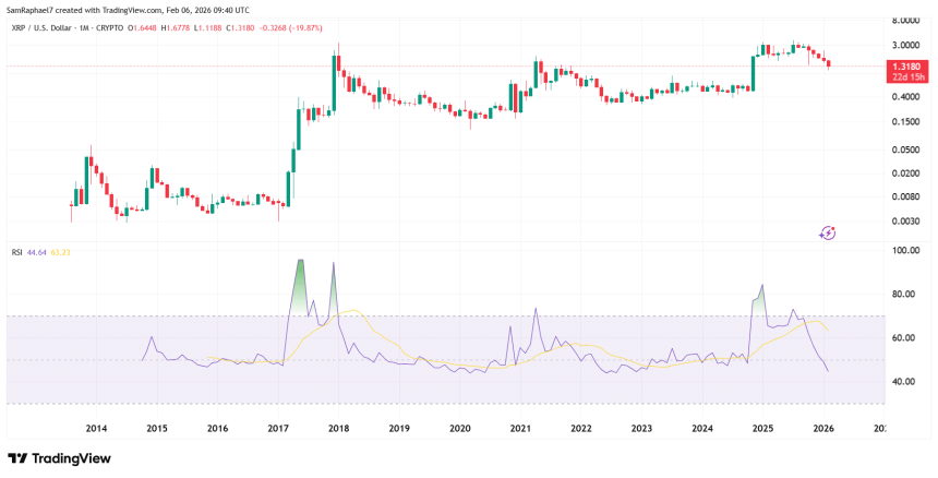 Amid this downturn, $XRP has lost over $18 billion worth of market value this week, down nearly 19% within this period. Notably, prices have dipped below the $1.5 and $1.4 levels, now battling at $1.3. With the latest crash, $XRP has now reached its most oversold level in history across the daily, weekly, and monthly timeframes.