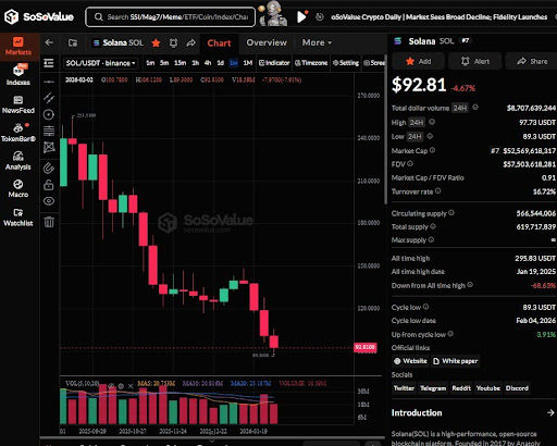 According to an update by BitGuru, Solana has been moving lower in a series of step-down declines, reflecting sustained bearish pressure. Price has now reached a key demand zone between $90 and $95, an area where buyers have previously stepped in to defend the market.
