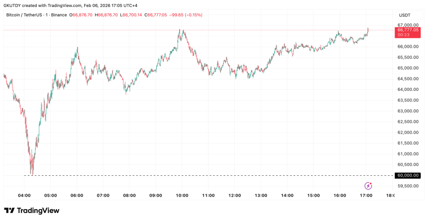 The move began during early U.S. hours when cascading liquidations — triggered by failed support at $66,000 — accelerated down through $62,000 and briefly touched $60,000 before instantly bouncing.