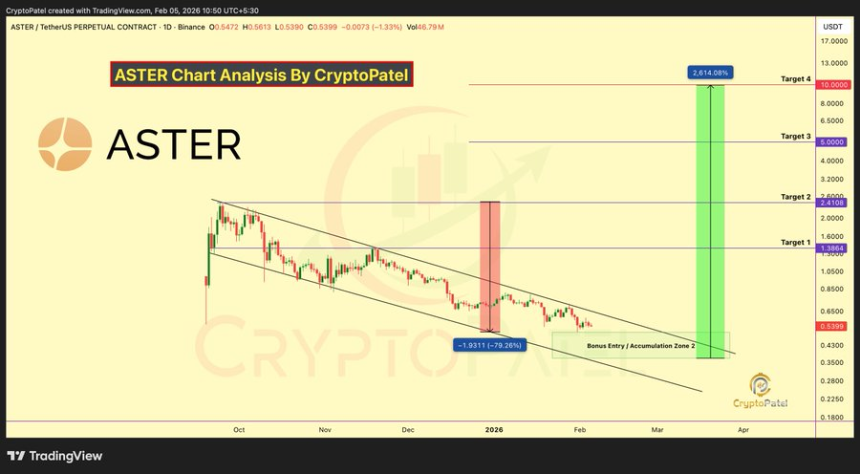 Meanwhile, Patel sees 2,600% upside potential with targets between $5 and $10 for Aster price. A close above $0.72 could signal the end of the descending channel.