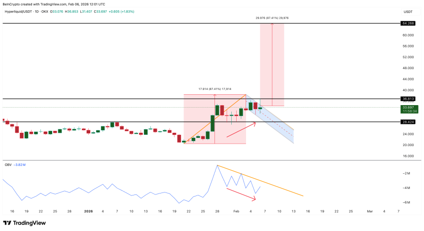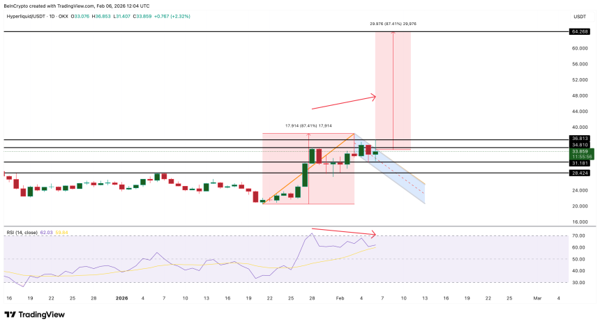 Between January 28 and February 4, the Hyperliquid price formed a higher high, while the Relative Strength Index (RSI), a momentum indicator, printed a lower high. This bearish divergence, sellers gaining control, was followed by a drop toward $31 before buyers returned.