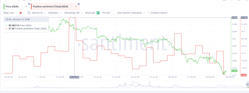 Positive sentiment has fallen sharply since mid-January, dropping from around 57 to near 6, a 90% dip and a monthly low. Cardanos strongest moves were often supported by rising optimism, as seen towards the end of January, when a local positive sentiment high coincided with a 9% price bounce.
