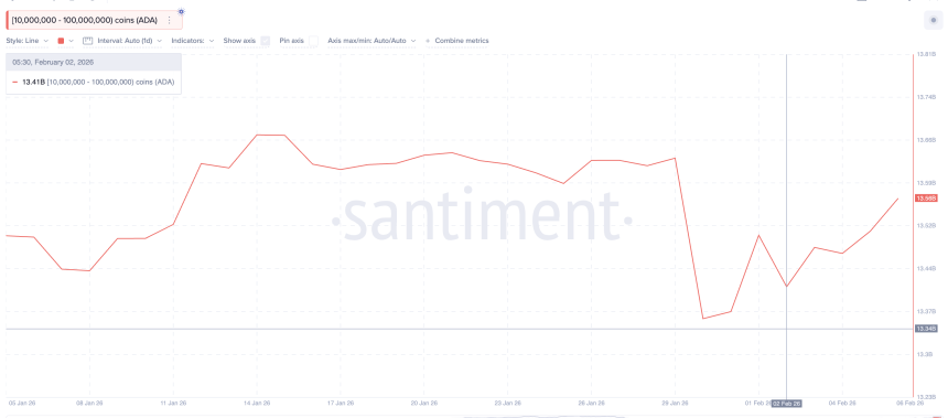 Wallets holding between 10 million and 100 million $ADA increased their combined holdings from around 13.41 billion to approximately 13.56 billion since early February, almost $40 million. More importantly, these addresses did not reduce exposure during the sharp drop toward $0.22.