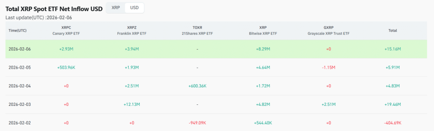 Despite this, $XRP ETFs saw intraday capital inflows four times out of five last week. Notably, the only outflow involved –$404K on Feb. 2. As the week progressed, the products only witnessed inflows, including $19.46 million on Feb. 3, $4.83 million on Feb. 4, and even $5.91 million on Feb. 5, the day $XRPs price collapsed 19%. On Feb. 6, the products saw $15.16 million in inflows.