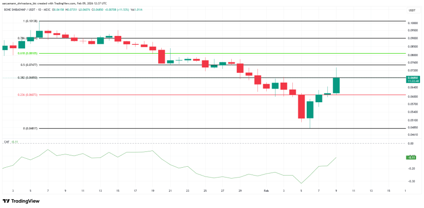 This recovery remains valid as long as the price holds above $0.0607 on a daily closing basis. A breakdown below this support would fully invalidate the bullish reversal, sending BONE to $0.0481.