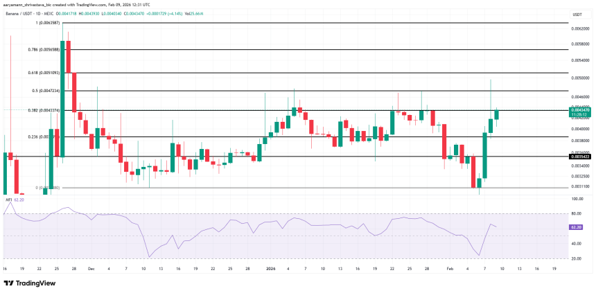 On the other hand, failure to break $0.0043 may trigger a pullback toward $0.0039. Losing the 23.6% Fibonacci support would weaken the structure. Under that scenario, $BANANAS31 could slide to $0.0035, invalidating the bullish thesis and erasing the meme coin‘s recent recovery gains, sending it back to early February’s price.