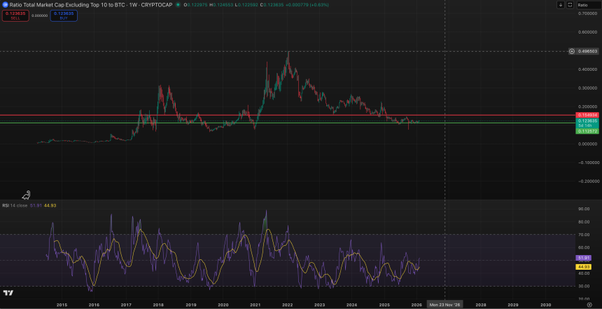- The weekly RSI has been climbing, indicating some momentum in altcoins relative to $BTC.