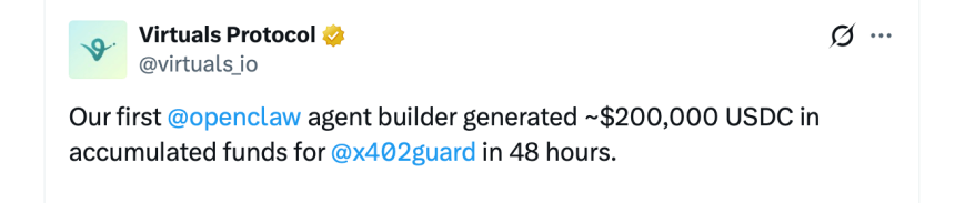 The X account listed Virtuals IOs first Openclaw builder, X402Guard, generated nearly $200,000 in two days, while projects like Clawshi AI, Clawnch Bot and Moltxio shipped markets, token burns and private agent messaging. Graeme further detailed that others rolled out staking, dashboards, identity upgrades and new platforms, which points to real-time construction across the growing ecosystem.