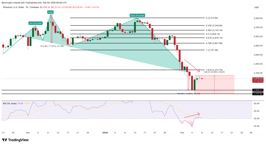 On February 5, Ethereum completed a major breakdown pattern on the daily chart, as predicted by BeInCrypto analysts. This pattern usually signals that sellers are taking control. The projected target was near $1,800. Ethereum price followed that path and dropped to $1,740 on February 6.
