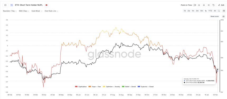 In early February, as Ethereum dropped to $1,740, short-term holder NUPL fell to around -0.72, placing it firmly in the capitulation zone. This reflected heavy unrealized losses among recent buyers.