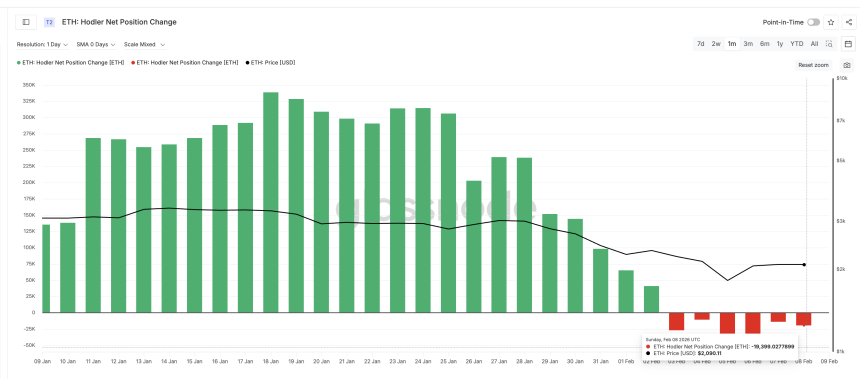 The 30-day rolling Hodler Net Position Change, which tracks investors holding $ETH for more than 155 days, remains negative. On February 4, outflows stood near -10,681 $ETH. By February 8, they had widened to around -19,399 $ETH.