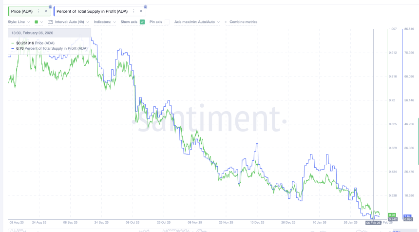 The percentage of total $ADA supply in profit has fallen from above 33% in mid-January to about 8% in early February. That represents a decline of roughly 75%. It places profitable supply close to its lowest level in six months.
