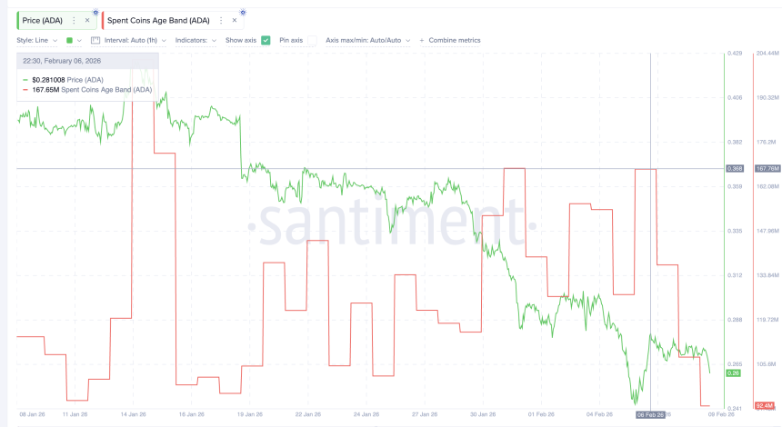 Another supportive signal comes from spent coins age data, which tracks how many coins, across old and young cohorts, are being moved. During the February 6 sell-off, coin activity surged to around 168 million $ADA. Since then, it has dropped to roughly 92 million. That is a decline of about 45%.