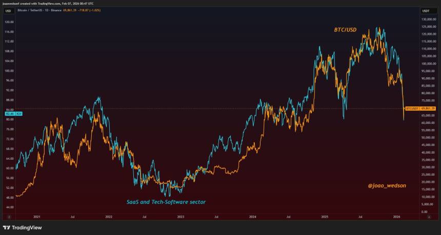 Data also indicates that the correlation between software stocks and Bitcoin has persisted for more than five years. This pattern is not new. It supports the view that private credit flows have materially influenced the crypto market. Funds appear to treat Bitcoin and altcoins as if they were software companies.