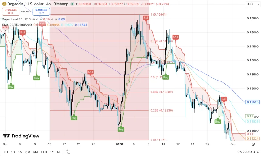 Dogecoin continues to struggle under persistent selling pressure as technical indicators point toward extended weakness. The cryptocurrency trades within a clearly defined downtrend on the 4-hour chart, printing successive lower highs and lower lows. This pattern confirms that sellers maintain control over price direction. Each attempted recovery faces immediate resistance, preventing any meaningful reversal from taking hold.