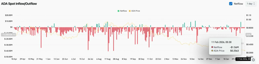Spot flows show continued distribution. Cardano recorded $1.56M in net outflows on February 11, extending a pattern of selling pressure that has persisted through much of 2026.