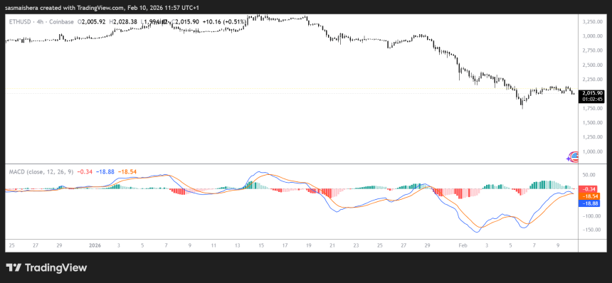 The $ETH/USD 4-hour chart remains bearish as Ether has dropped below $2,100 following Mondays rally. At press time, $ETH is now trading at $2,011 per coin.