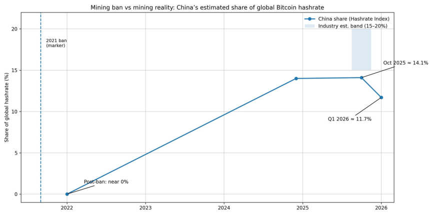 One data point complicates the tightening narrative: China's Bitcoin mining share rebounded to roughly 14% by October 2025, according to the Hashrate Index, with some industry estimates placing it between 15% and 20% of global mining.