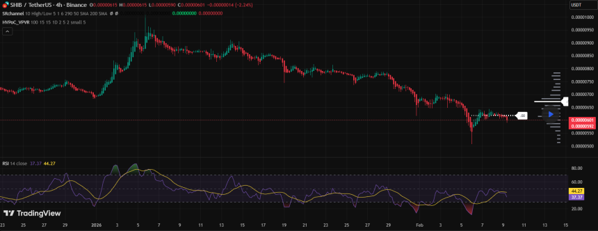 An accompanying 4H chart shows that Shiba Inu is currently consolidating around the weekly support level of $0.0000060. The token experienced a brutal dump on February 6, capsizing to $0.00000507 before a notable rebound.