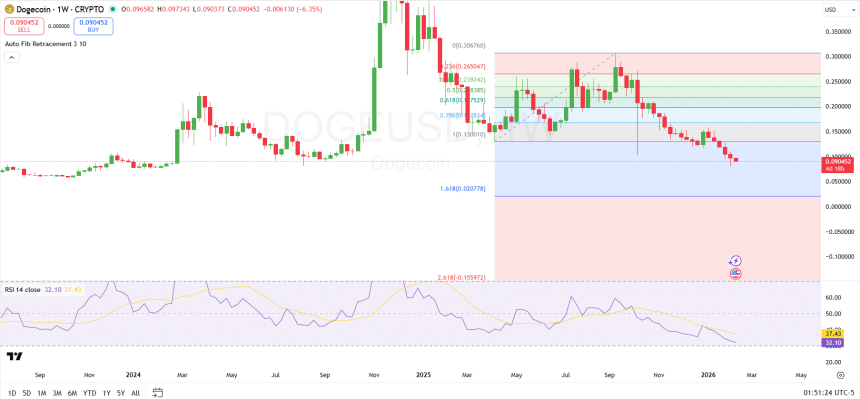 WikiBit 2026-02-11 20:02Dogecoin breaks below a key Fibonacci extension as weekly RSI nears oversold, but an analyst says ch