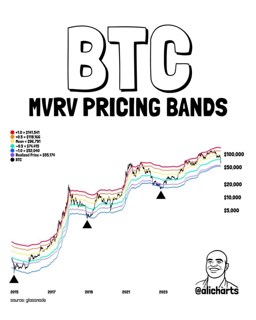 Adding to the discussion, crypto analyst Ali Martinez highlighted historical price behavior in a post on X. He noted that Bitcoin has often found a bottom near the −1.0 MVRV Pricing Band. Based on current calculations, that level stands at $52,040.