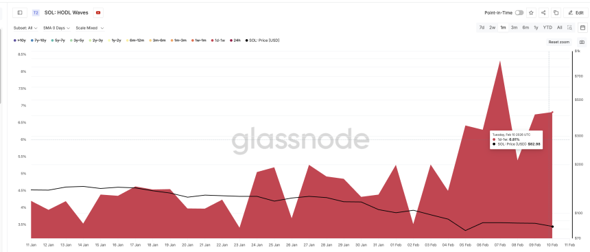 Historically, this group has struggled to provide lasting support. For example, on January 27, short-term holders controlled around 5.26% of the supply when $SOL traded near $127. By January 30, their share fell to 4.31% after selling, and the price dropped about 8%. Similar behavior is now emerging again.