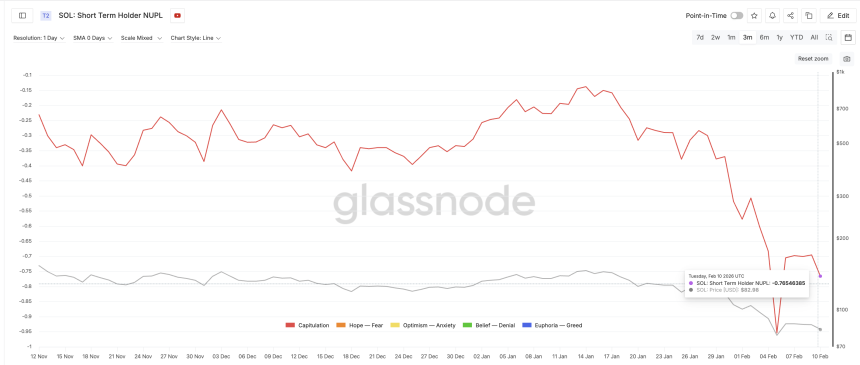 At the same time, Profit and Loss data shows limited incentive to sell immediately. Net Unrealized Profit/Loss (NUPL) for short-term holders remains in the capitulation zone. NUPL compares the current price to the average purchase price to measure whether holders are in profit or loss.