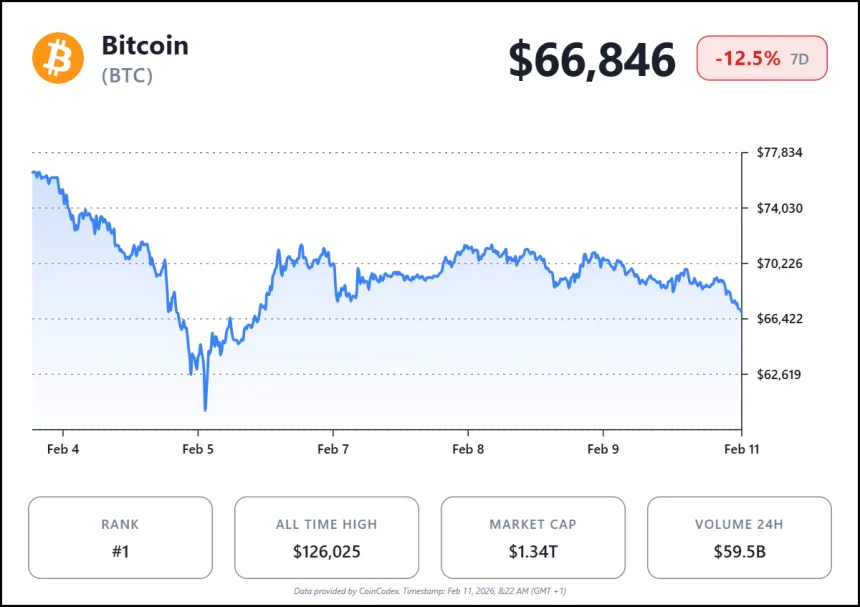 WikiBit 2026-02-12 06:02Bitcoin traded below the $67,000 level amid heightened volatility, triggering a fresh wave of liquid