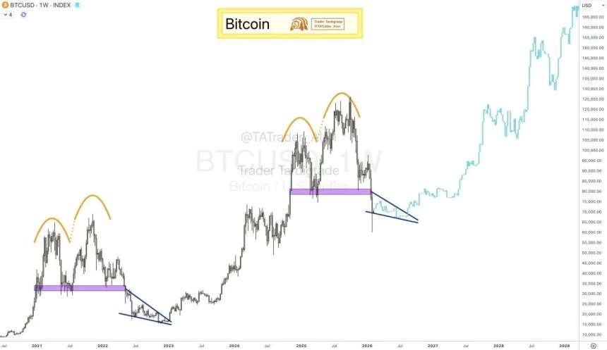 Trader Tardigrade said the move below support followed a double-top formation and framed the present range as a contracting triangle on the two-week timeframe. The projection on the right side of the chart sketches a possible recovery path after compression, although the chart itself only shows the structural comparison between past cycles and the current setup. As of the snapshot, Bitcoin traded below the former support area while price action continued to coil inside the narrowing range, leaving the next directional break dependent on how price resolves the triangle.