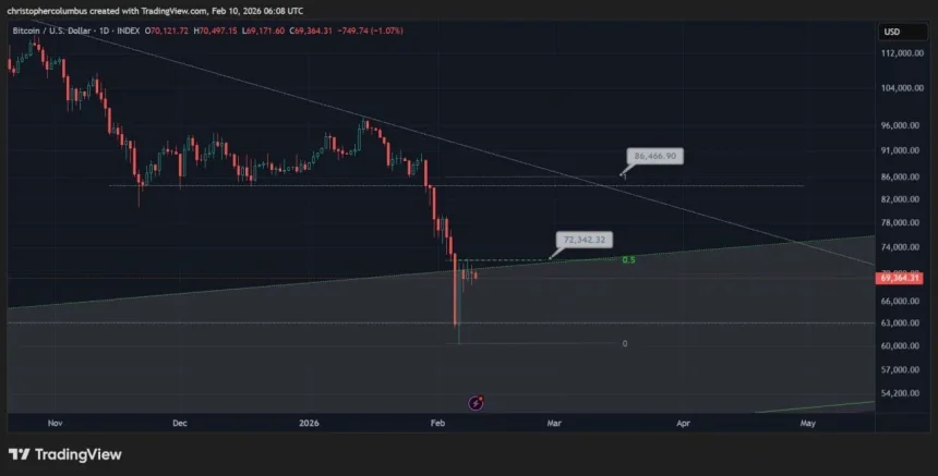 Dave the Wave said that, in the shorter term, a move back above $72,000 would open room toward the mid-$80,000s. As of the snapshot, Bitcoin consolidated just above the lower boundary of the recent drop, with price compressing under resistance and near rising support, leaving the next move dependent on whether price can reclaim the $72,000 area or remain capped by the descending trendline.