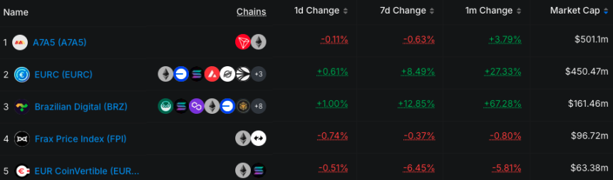 Top five largest non-USD stablecoins by market capitalization. Source: DefiLlama
