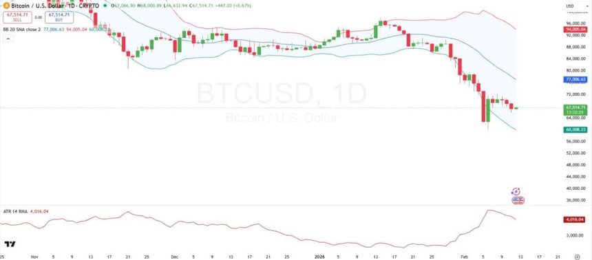 Bitcoins technical structure remains fragile, with price still trading near the lower boundary of its volatility range. Immediate support is now established around the lower Bollinger Band near $60,012, which acted as a critical defense point during the recent sharp selloff. This level represents the last major volatility floor before the deeper psychological zone around $60,000.