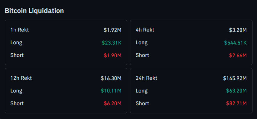 Bitcoins recent liquidation data reveals that over the past 24 hours, total liquidations reached approximately $145.92 million, with short positions accounting for $82.71 million, compared to $63.20 million in long liquidations.