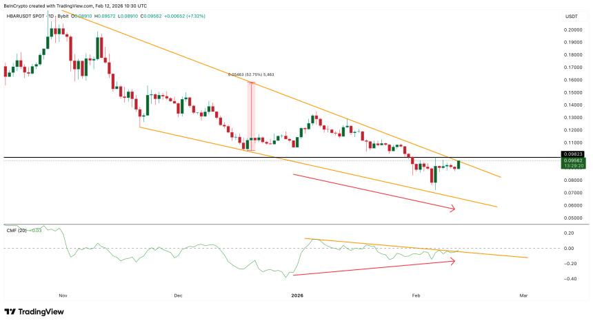 Between December 31 and February 11, $HBARs CMF has trended higher while the price trended lower. This divergence supported the recent rebound. CMF has also broken above its descending trendline. But CMF remains below the zero line.