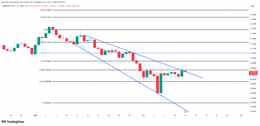 $HBAR price sits at $0.0923, trading within the descending broadening wedge. Immediate resistance at $0.0938 continues to cap upside attempts. A confirmed breakout requires flipping $0.1005 into support and breaching $0.1071 decisively.