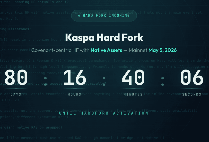 According to Terahs thread,Kaspa is preparing a covenant-centric hardfork scheduled for mainnet activation on May 5, 2026. The upgrade expands Layer 1 (L1) programmability by introducing native assets and extended covenant functionality. It also lays the groundwork for verifiable programs (vProgs) and zero-knowledge (ZK) integrations.