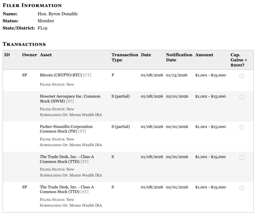 United States Rep. Byron Donalds has released a new financial disclosure showing a cryptocurrency purchase at a time when digital asset markets have been under pressure.