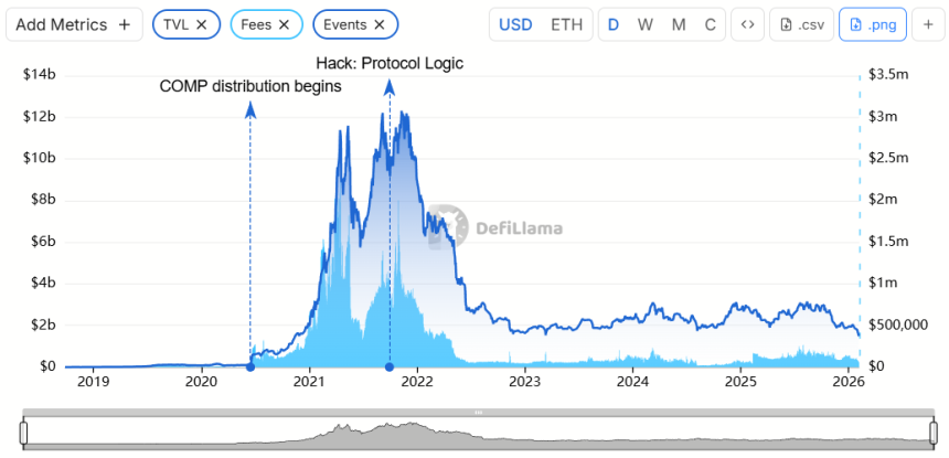 The decline is evident in Compounds total value locked (TVL), which fell sharply from a November 2021 peak of $12 billion to just $2.2 billion by November 2022, per data from DefiLlama.