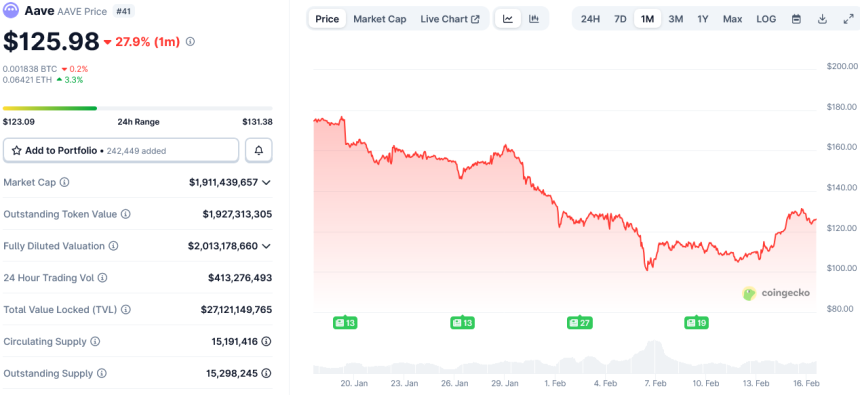 $AAVE has fallen 15.2% so far in 2026 to $125.98 and is now 81% off its $661.70 all-time high set in May 2021.