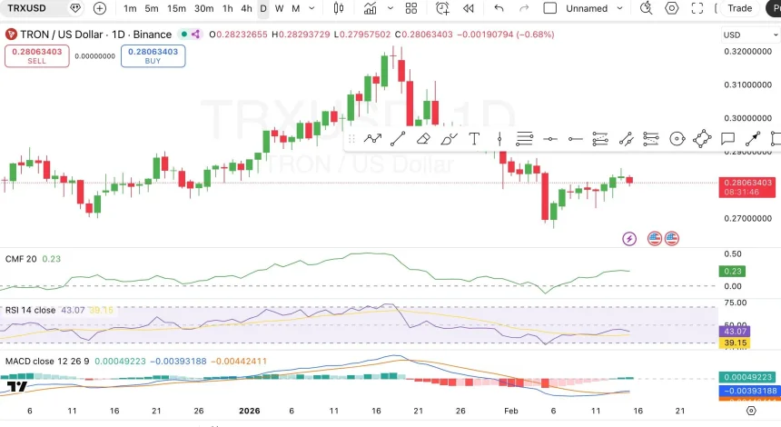 The announcement comes at a time when $TRX has been showing signs of stability and positive momentum. While the price of $TRX recently fluctuated between $0.2795 and $0.2829, with a slight decline of 0.66%, technical indicators suggest that $TRX might be poised for a potential breakout. As the market continues to analyze the coin‘s price movement, Tron Inc.’s strategy of increasing its $TRX holdings has created a sense of optimism around its future performance.